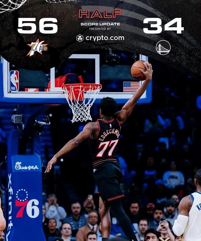 次节回来,贾巴里-沃克接球三分再中,76人领先到23分。斯潘塞急停后仰跳投命中,穆迪45度角连续投进大空位三分,一人连拿8人,带领勇士打出10-0小高潮,追至13分打停76人。VJ-埃奇库姆和格林互飙三分,巴洛篮下大帽穆迪,随后反击快速跟进完成补扣,梅尔顿挡拆后顺下,接到穆迪传球打进复出后首个进球。库明加运球砸到脚上出界,马克西反击急停跳投再中,76人重新取得20分领先优势。梅尔顿三分顶着防守强投不进,库明加罚球线附近直接起飞,在恩比德头上完成单臂补扣,又一个十佳球。麦凯恩压哨三分跳投再命中,半场战罢,76人56-34领先勇士22分。