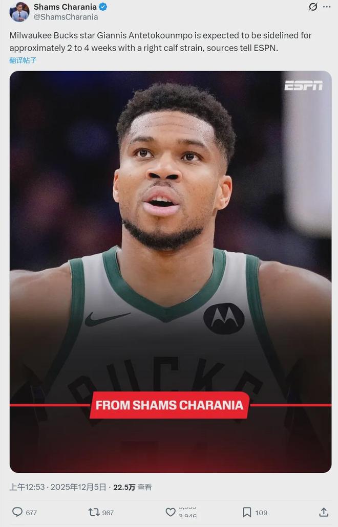 北京时间12月5日凌晨1点,据NBA名记Shams报道,字母哥右小腿拉伤,预计将休战2-4周。在雄鹿和活塞的比赛中,开场3分钟字母哥因伤退赛。中外球迷纷纷表示:雄鹿这是对字母哥进行交易保护,害怕他在交易之前再次受伤。