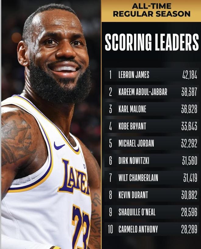 最近NBA官方更新了历史常规赛得分榜,哈登在对阵76人的比赛中砍下28分,生涯总得分正式突破28000分,升到历史第11位。 这一夜不仅让他跻身“28000分俱乐部”,也把和前面的安东尼、奥尼尔之间的差距继续缩小。 另一边,詹姆斯已经把历史得分纪录推到42184分,杜兰特、威斯布鲁克等现役球星同样还在榜单上持续累加。 下面这份榜单会把历史前20位常规赛总得分一一列出来,所有数据统计截至2025年11月18日。 榜单1-101 詹姆斯(LeBron James) 国籍:美国 常规赛总得分:42,184 年龄:40岁 职业生涯效力球队:克里夫兰骑士、迈阿密热火、洛杉矶湖人