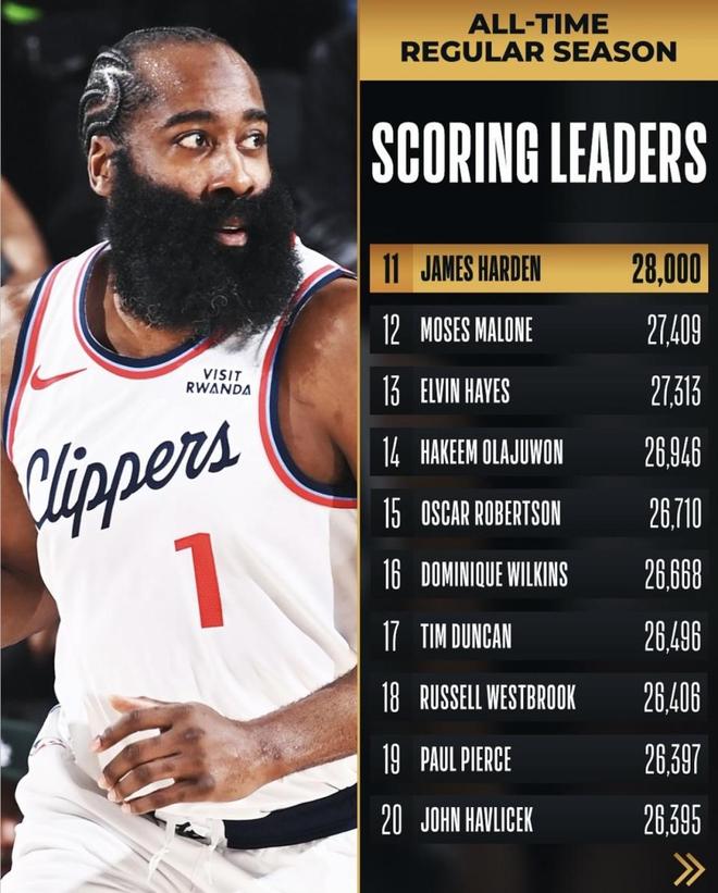 NBA历史常规赛得分榜发布!哈登突破28000分 前十