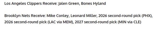 四方交易方案潜在的细节如下 森林狼得到:获得詹姆斯・哈登(快船)、海伍德・海史密斯(快船) 快船得到:获得贾伦・格林(太阳)、海兰德(森林狼) 篮网得到:获得迈克・康利(森林狼)、伦纳德・米勒(森林狼)、2026年第二轮选秀权(来自太阳)、2026年第二轮选秀权(来自快船)、2027年第二轮选秀权(来自森林狼) 太阳得到:获得兰德尔 那么,这笔交易对于各支球队的影响如何呢?