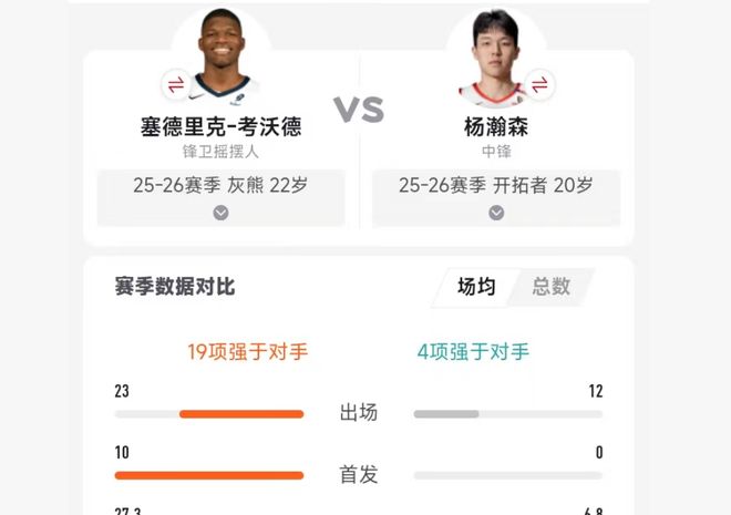 就在杨瀚森在发展联盟大杀四方,砍下20+7+7准三双数据时,同届新秀科沃德已经成为灰熊三号位新的答案。在击败快船的比赛中,科沃德首发出战28分钟就拿下20+10带队击沉快船,即便对面站着伦纳德和哈登,科沃德依然打的非常从容。看的开拓者队记都酸溜溜表示:“球队选秀本该选一个即战力(科沃德),而非杨瀚森”。 科沃德真的更好吗?目前看确实如此,22岁的他不仅坐稳灰熊首发小前锋位置,场均上场时间也已经达到27.3分钟。得分方面,科沃德场均13.4分妥妥的球队三当家水平,而杨瀚森场均2.5分,只能挥舞毛巾看守饮水机。二人数据横向对比,科沃德有19项数据强于杨瀚森,而杨瀚森只在盖帽和失误两项数据强于科沃德,哪怕小白球迷都能看出二人根本不是一个量级的球员。