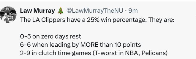 第三,快船多项数据背靠背第二天的比赛0胜5负。 第四,领先10分的比赛6胜6负。 第五,关键时刻(最后5分钟分差5分以内)的比赛2胜9负,和鹈鹕并列联盟最差。