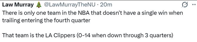快船记者Law Murray晒出数据:NBA本赛季只有一支球队在进入第四节落后时从未赢过球。这支球队就是洛杉矶快船队(前三节落后时战绩为0胜14负)。”
