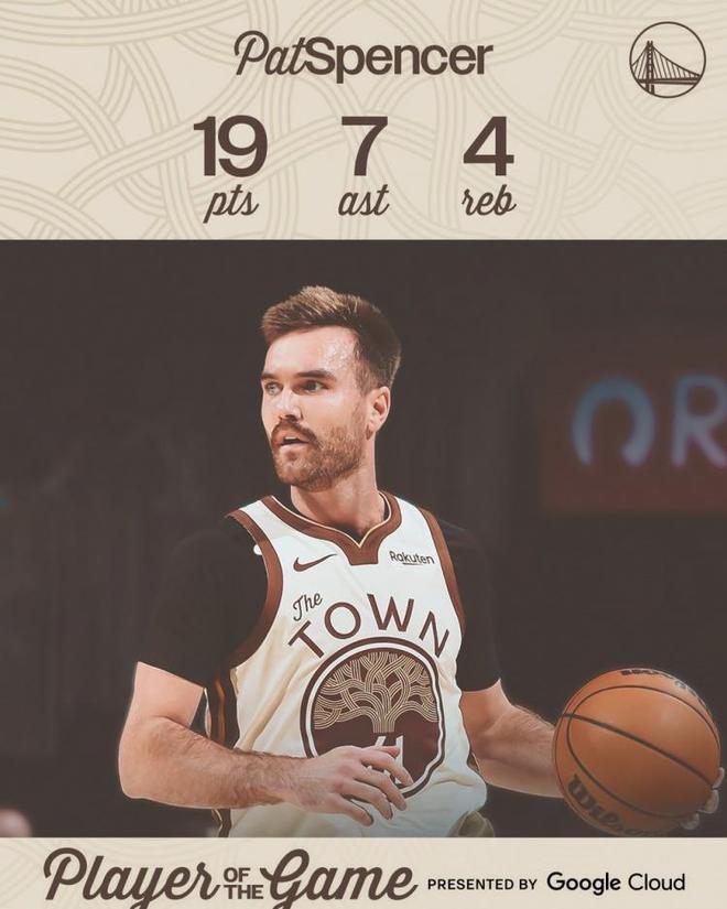 全场比赛,斯宾塞12中7,三分4中3高效轰下创生涯新高的19分,其中12分来自于末节,外加4篮板7助攻1抢断。 面对斯宾塞这样的表现,勇士官方赛后发文将其评选为本场最佳,并配文:“61号挺身而出!”