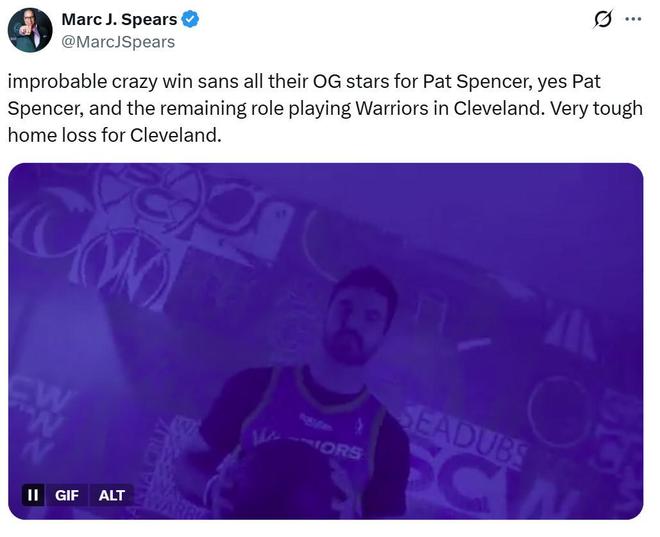 正如名记Marc J. Spears所说,斯宾塞是本场勇士毫无争议的第一功臣,在所有主力老将都未出战的情况下,是他率领一众角色球员从客场送给骑士队一场难以接受的失利。 而这也是斯宾塞获得重用后傲人表现的缩影,过去三场比赛斯宾塞场均可以拿下17.3分3.7篮板5.7助攻1抢断。