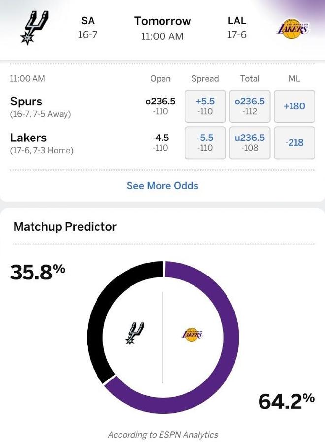 双方本赛季有过一次交锋,湖人当时主场118-116险胜马刺,两队将争夺一个NBA杯四强的名额。ESPN给出获胜概率:湖人64.2%、马刺35.8%。 (文/醉卧浮生) |