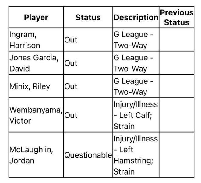 马刺伤病报告: 文班亚马:小腿伤势缺席 麦克劳林:腿筋伤势出战成疑 英格拉姆:双向球员下放G联赛缺席 加西亚:双向球员下放G联赛缺席 米尼克斯:双向球员下放G联赛缺席