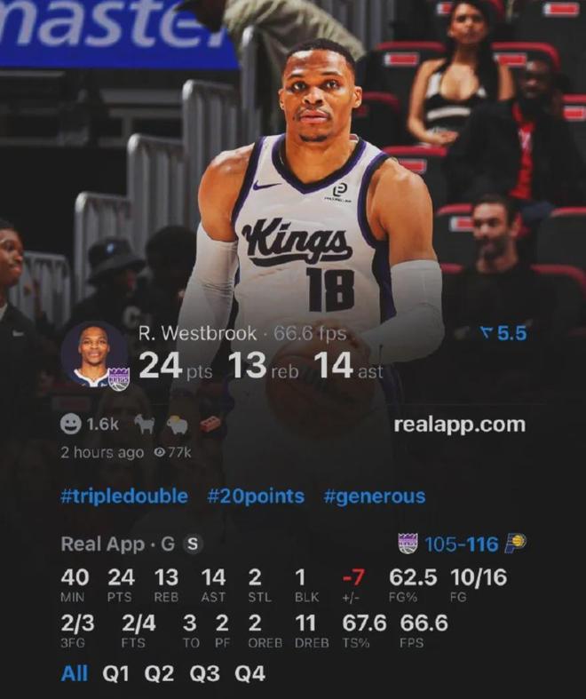 国王最终以105比116输给步行者,但威少爷拼到了最后,他轰下24分13篮板14助攻2抢断1封盖的数据,出现3次失误瑕不掩瑜。 全场比赛,威少爷的运动战出手是16投10中,在三分线外3投2中,真实命中率是全队最高的67.6%。