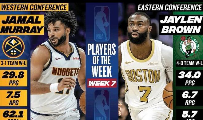 公布球队实力榜的同时,NBA官方还公布了上周的周最佳球员;其中西部正是由掘金二当家贾马尔-穆雷当选,而东部由凯尔特人前锋杰伦-布朗当选。上周比赛里,贾马尔-穆雷共出战4场,场均得到29.8分7.5助攻,三分球命中率62.1%,率领掘金拿到3胜1负。杰伦-布朗共出战4场,场均贡献34分6.7篮板5.7助攻,率领凯尔特人4战全胜。 对于凯尔特人来说,尽管没有塔图姆,休赛期又损失了霍勒迪、波神、霍福德等多名夺冠功臣,但由于球队拥有深厚的强队文化底蕴;再加上布朗上任球队老大后也没有辜负大家的期望,持续进化,凯尔特人得以继续保持季后赛实力。