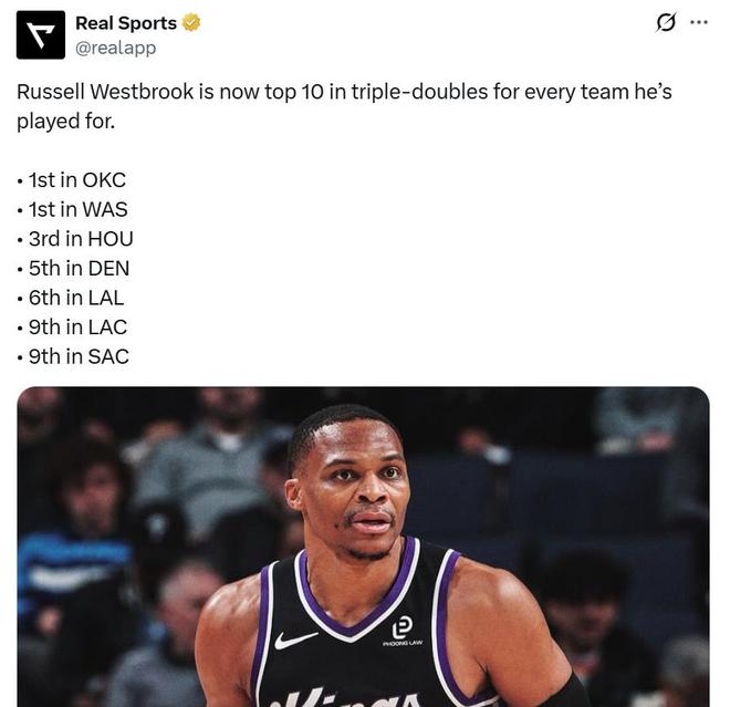 本场比赛也是威少开季至今第4次拿下三双,生涯第207次,继续高居历史第一,虽然按照产销与差距来看,约基奇很快就会完成反超,但目前威少依旧是实打实的NBA历史三双王。 同时本场作为国王再次拿下3双后,威少在国王队史三双榜单排名上升至第9,这让威少又迎来一项神迹,即生涯至今在效力的7支球队中三双数均杀入队史前十。 具体为雷霆(第一)、奇才(第一)、火箭(第三)、掘金(第五)、湖人(第六)、快船(第九)、国王(第九)。