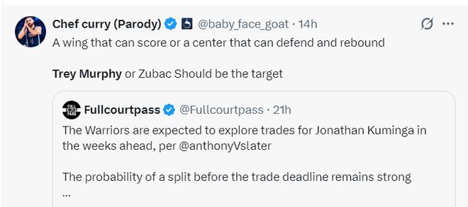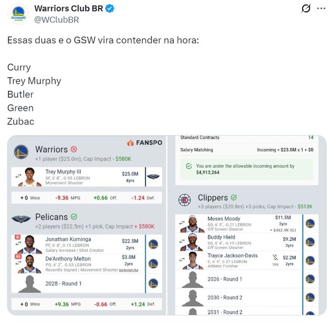 勇媒Warriors Club BR还真模拟了两套方案换取墨菲与祖巴茨, 第一套:勇库明加、梅尔顿、2028年首轮签换墨菲; 第二套:穆迪、希尔德、戴维斯、2026年首轮、2030年次轮签、2031年次轮签从快船换来祖巴茨、邓恩。 这两笔交易达成后,勇士队的先发阵容可以是库里、巴特勒、墨菲、追梦、祖巴茨,勇士队的硬实力将大幅提升。