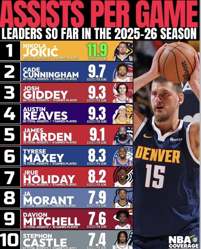 美国媒体nba worldwidecoverage晒出了2025-2026赛季至今的场均助攻榜单,约基奇、高居榜首,场均11.9次助攻,把队友都“喂饱”了。坎宁安、吉迪、里夫斯、哈登等后面一长串组织核心也都上榜,分布在东西部多支球队。 这个榜单的数据截至北京时间2025年11月10日,只看这阶段的表现,就能大概感受到谁在真正掌控球队进攻节奏。接下来就按排名,把这10名球员的数据一一列出来。