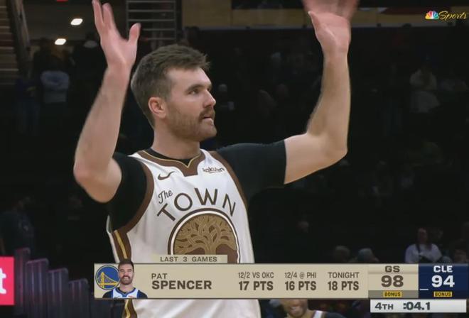 比赛进入最后五分钟,勇士连续失误,一度三分钟没有得分,骑士再度将分差追到5分以内。 此时,又是斯潘塞站了出来,他先是过掉加兰,从莫布利和米切尔的合围中杀出,迎着亨特的补防抛投出手,球在筐上转了一圈掉入网中,骑士无奈喊出暂停。 斯潘塞彻底释放自我,朝着观众席喊出了文章开头的那段话,这一刻他真真正正地成为了一名NBA球员。 终场结束前4秒,斯潘塞两罚两中杀死比赛悬念,随后朝着主场的克利夫兰球迷挥手告别,嘲讽力拉满。 毫无疑问,在这场比赛中,他就是故事的主角。
