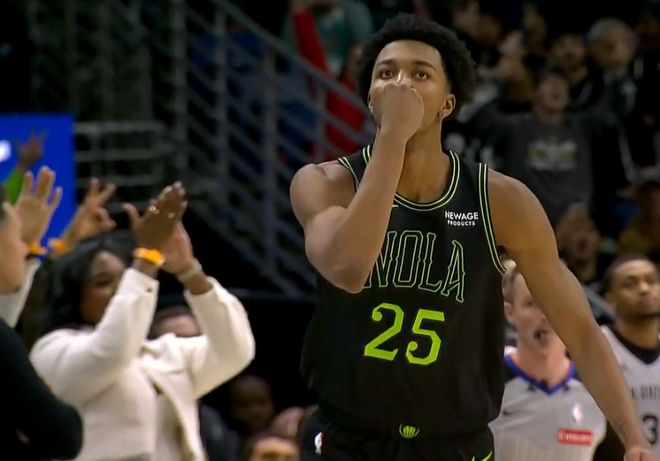 第3节比赛中,今年13号秀奎因出战11分钟6投全中,罚球9中9独砍21分,创造NBA历史最年轻单节以100%命中率砍下20+的神迹纪录。 第四节决战,奎因分底角队友三分投进,29+10+10拿到生涯首个三双,阿尔瓦拉多反击高抛长传,墨菲跃起平框空接单臂暴扣,鹈鹕反超比分。哈珀两分突破得手,再反超比分,最后一攻,奎因大空位三分遗憾不中,最终,鹈鹕132-135不敌马刺,未能完成25分大逆转,狂送7连败。