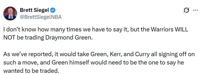 Siegel转发了Fischer的报道,并写道:“我真的不知道这句话还要强调多少遍:勇士队绝对不会交易格林。正如我们此前所报道的,这样的交易想要达成,必须得到格林、科尔和库里三人的一致同意,而且必须是格林本人主动提出想要离队才行。” 美媒Heavy随后点评道,格林在勇士队的重要性是多维度的,这一点早已是公开的事实。他依旧是联盟中球商顶尖的防守球员,是勇士多套冠军阵容的攻防指挥官,他的临场决策能力至今仍在为库里的赛场表现赋能。他的价值绝不能只用数据面板来衡量,更体现在球队体系搭建、攻防节奏梳理以及关键时机把控上。