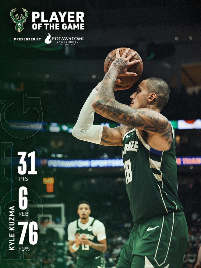 库兹马此战的得分创下雄鹿生涯新高,他打出了密尔沃基生涯的最强一战。库兹马上半场砍下了18分,次节独得14分率队紧咬比分。下半场,库兹马再得13分。第3节,库兹马狂轰11分,率队打出了27比13的单节比分,就此锁定大局。 小波特3双 雄鹿队后场虎将小凯文波特,实现了全方位爆发。曾为火箭、快船效力的小波特,在此役证明了自己。小波特上场32分钟,10投6中,三分3中1、罚球8中5,轰下了18分10篮板13助攻1抢断的3双数据。小波特以60%的命中率轰下了全队的第三高分,他还是此战的篮板王。 小波特持球进攻