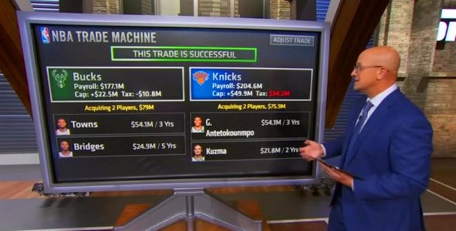 专家晒2换2交易 为此,薪资专家Bobby Marks晒出了一笔2换2交易方案,具体内容如下: 尼克斯得到:字母哥+库兹马; 雄鹿得到:唐斯+布里奇斯。