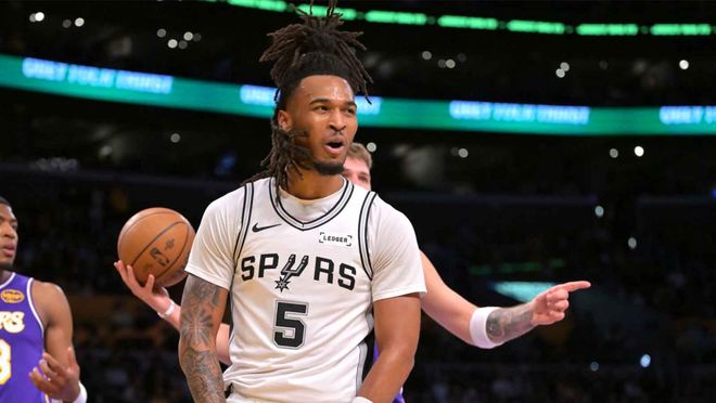 3.卡斯尔,圣安东尼奥马刺 上一期排名:未上榜 候选理由:在杯赛四分之一决赛中,卡斯尔彻底撕碎了洛杉矶湖人的防线——说“撕碎”毫不夸张,湖人几乎没能对他形成任何有效阻拦。他也借此打出了赛季最佳表现:14投10中,砍下赛季新高的30分。整场比赛,他几乎予取予求。除此之外,他仅出战27分钟,就还拿下10个篮板和6次助攻,这样的每分钟效率堪称惊人。 而在本届杯赛的上一轮比赛中,卡斯尔就曾面对金州勇士砍下23分10篮板10助攻的三双数据,成为马刺取胜的绝对功臣。在文班亚马因伤缺阵的情况下,卡斯尔为马刺提供了至关重要的进攻火力。