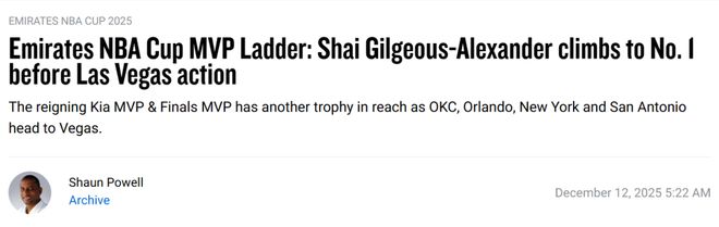 NBA杯MVP排名更新:亚历山大升至第一 尼克斯双星