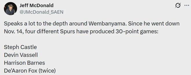 这些人不是在马刺赢了湖人之后才“得便宜卖乖”,他们的话都是有数据支撑的。 据统计,文班亚马11月15日受伤休战以来,马刺阵中已经有4人单场砍下30+得分,分别是卡斯尔、瓦塞尔、哈里森·巴恩斯和达龙·福克斯(2次)。
