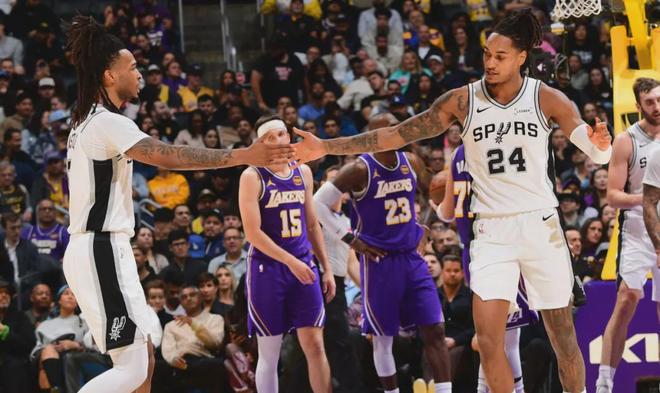 卡斯尔高效拿到30分,另有10篮板6助攻,存在感十足。比赛之前,我很好奇两边后场交手的画面。跟东契奇、里夫斯这样的全方位进攻主理人相比,马刺这几个风格是完全不一样的,而最具辨识度、最有差异化内容的还是卡斯尔。他天赋不俗,拥有“模糊的正确”,囫囵吞枣地上分,稀里糊涂地失误,然后认真地回防。看着很带劲儿。 跟这个带劲儿形成对比的是湖人的沉闷。湖人全场比赛最具爆炸力的时刻,应该是詹姆斯隔扣科内特和追冒福克斯,而这来自于一名40岁的老将。其他的,嗯...海斯篮下有过一个排球大帽。别的活力时刻,没印象了。 我记得上一次湖人输给雷霆后,记者说,看起来雷霆得分很轻松,而湖人每得一分都很困难。但湖人不是得分费劲的球队,全联盟得分比东子更轻松的球员也应该极其罕有,对马刺他也贡献了自己的平均火力。詹姆斯则做了他该做的。小里熄火了,至于小里为什么熄火,可能并不重要,一个赛季27.8分的球员,有50分的夜晚也可以有不到20分的夜晚,他算正常的均值回归。斯马特命中8记三分超水平发挥,算补了小里那一份。湖人进攻不如平时,但看了比赛的小伙伴也都明白,湖人不是输在这上面。 湖人的防守漏人太离谱了: 就这样很随意地找错了对位; 退防漏三分漏; 退防慢的离谱,门户大开。 这些内容都没有上升到防守天赋层面,属于专注度、投入与纪律性的问题。可以用两个字归纳——松散。 这是对湖人这场杯赛的最大印象。 上个赛季的湖人,单兵防守素质也一般,但常规赛展现的团队防守是不差的,有些比赛交出的内容甚至可说惊艳。湖人没有把这些好的画面拿到这场,本赛季的总体防守效率也不如上一季。 从人员和具体用人上讲,湖人本季单兵防守素质,未必就赶得上前有浓眉后有电风扇的去年。斯马特能防,出勤差点意思,对阵马刺这样摆出三个后卫的首发,斯马特不直接顶上有点遗憾。你不能卡斯尔、福克斯面前一个正经领防人没有,八村追瓦塞尔也很奇怪。 但这甚至不是湖人防守最暗黑的画面,有拉拉维亚的衔接段才炸裂。我回头翻了翻今年看湖人的笔记,发现记的最多的话是“拉拉维亚防守白给”、“拉拉维亚被一步过”。 当你首发有一对进攻任务极重的白人后场,替补阵容还有一对同款造型的前锋时,这确实不太好面面俱到。而以往被认为防守还行的文森特,今年感受也不行。湖人的团队防守要改进,把力所能及的事情做好,他们不至于拿不下没有文班的马刺。但湖人真要有更高层次的想法,人还是关键。能防的不多,不能防的又太多,置换1~2个轮换在所难免。 马刺今年给人的惊喜不小,有很大一部分在文班之外,这也是我观察的重点,而文班受伤客观上提供了机会。没有文班的马刺9胜3负,远远超过了预期。