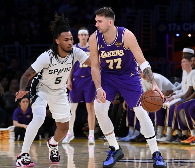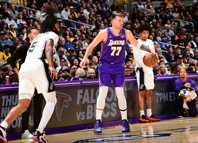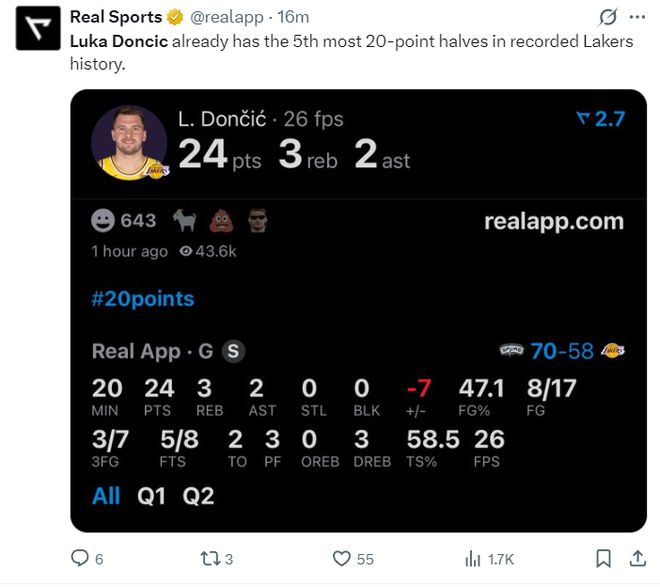 次节东契奇依旧延续自己的进攻感觉,但防守端就一片稀烂了,单节7中4+三分2中1拿到13分1助攻,半场拿到24分3篮板2助攻,东契奇半场20+的次数已经升至湖人队史第五位。