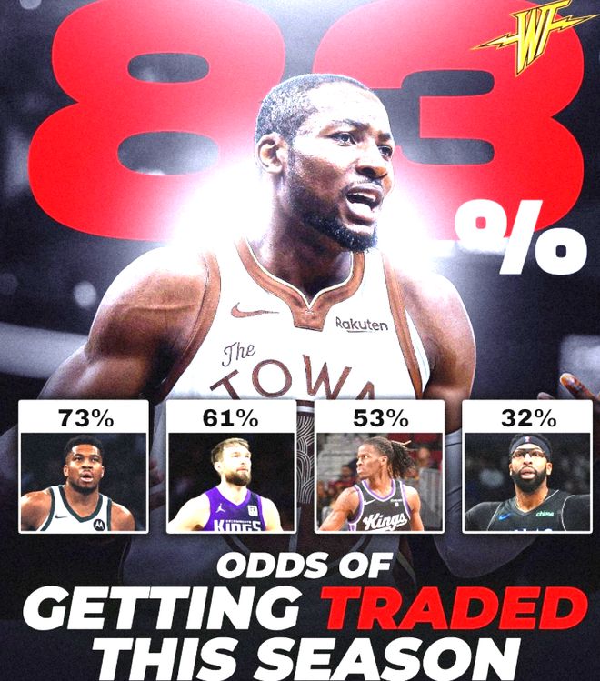 第四个劲爆消息是勇士有意拿库明加换特纳! 随着交易截止日的临近,各队的交易动向逐渐清晰,本赛季各球员被交易的概率榜单也随之曝光。榜单显示,勇士球员乔纳森·库明加以83%的概率位居第一,雄鹿球星扬尼斯·阿德托昆博以73%紧随其后,国王中锋多曼塔斯·萨博尼斯(61%)、国王后卫基翁·埃利斯(53%)以及前文提及的安东尼·戴维斯(32%)分别位列第三至第五位。