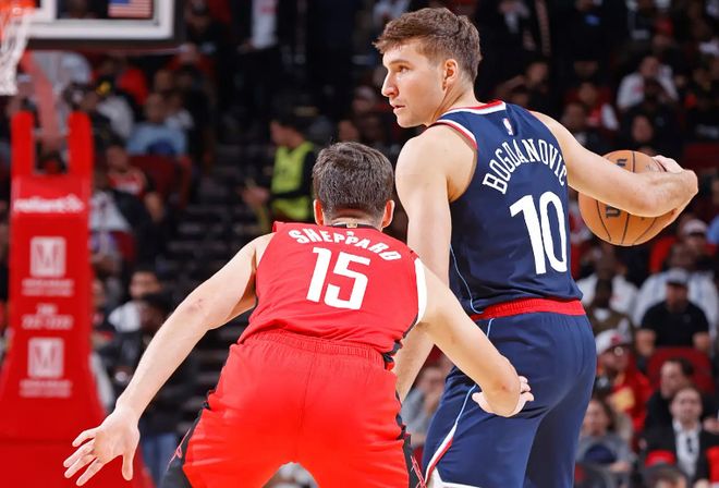 本场比赛中,快船的替补后场大将博格丹-博格达诺维奇(Bogdan Bogdanovic)的表现其实还算不错。博格达诺维奇全场出场24分22秒,投篮4中2,三分线外3中2,罚球4中4,得到了10分5篮板2助攻1抢断的数据,还有2次犯规,正负值为-2。博格达诺维奇没有得到太多的出手机会,但是他还是展现出了自己的投射能力,他也是具备一定的持球进攻能力的,他也能够完成一些支配球和分享球,他在进攻端的功能还是比较全面的。博格达诺维奇在防守端的贡献度比较有限,他的个人防守能力也比较一般,但这一点也是大家都知道的事情。其实博格达诺维奇也算是快船阵容中为数不多的几个具备不俗个人攻击力的球员,也是火箭感到有些不太好防守的球员,可惜他的战术地位还是低了一些,他也没有办法发挥出更大的作用。