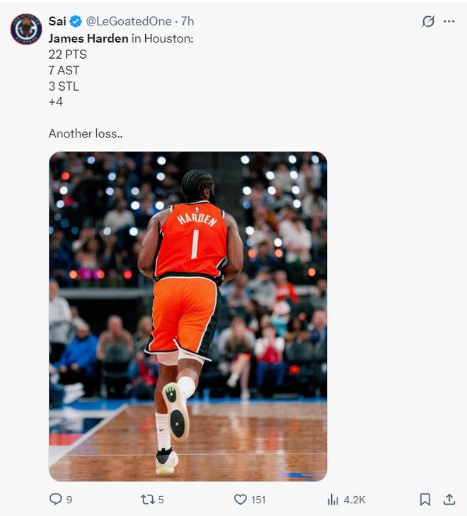哈登盛赞火箭略显心酸!示意队友接球无1人回应