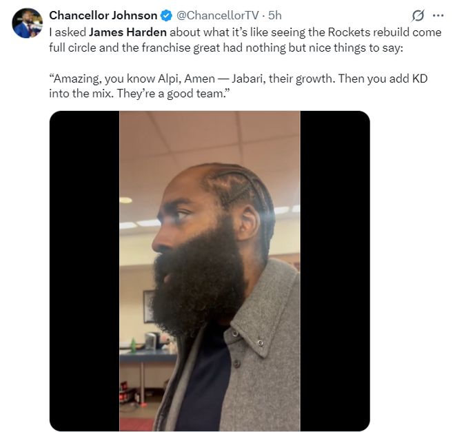 赛后哈登接受采访谈到这支全新的休斯顿火箭队:太棒了他们,你知道的,他们有阿尔佩伦(申京)、阿门、小贾巴里,这些年轻人成长的很快,然后杜兰特也被加起来了,他们已经是一支非常棒的球队。 大家有没有觉得哈登有些羡慕杜兰特?要知道这场比赛杜兰特37分钟14中5拿16分5失误,命中率35.7%火箭也能赢球,哈登夸奖老东家我觉得略显凄凉,他现在的处境就是凄凉。