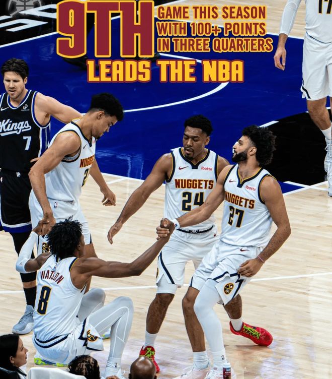 易边再战,穆雷连线约基奇再打进,掘金领先国王近31分,打停国王。埃利斯中距离跳投终于命中,打破球队近4分钟得分荒。沃特森和埃利斯互飚三分,基根-穆雷接连反击暴扣得手,国王追至24分分差。约基奇轻轻起跳打成2+1,皮克特接球三分还能命中,三节打完,掘金109-81领先国王28分。 截止到第三节,掘金本赛季已经9次三节得分过百,同样高居全联盟第一位,一战连创两大神迹。此外,约基奇三节16中14,三分2中2独砍36分12篮板8助攻2抢断。