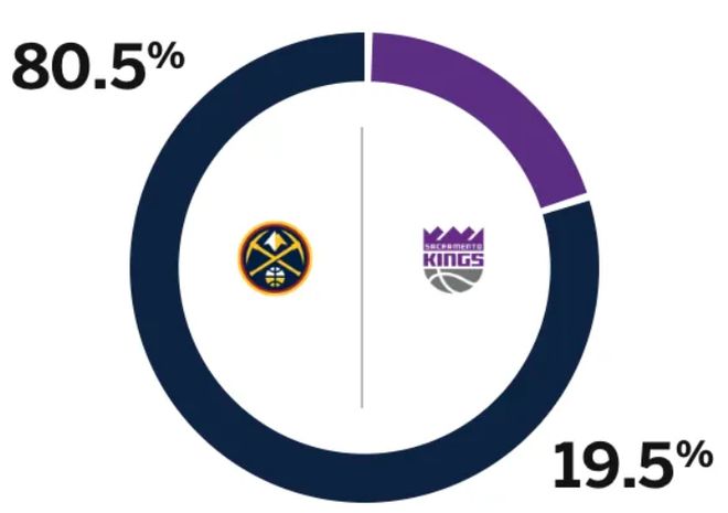 赛前,美媒ESPN对本场比赛进行了胜率预测,掘金队胜率高达80.5%,国王胜率则仅有19.5%,差距非常明显。 首发阵容方面,掘金队这边,阿龙-戈登(右腿筋拉伤)、布劳恩(左脚踝扭伤)与斯特劳瑟(背部伤病管理)3人缺战,教练排出的首发五人组为:贾马尔-穆雷、约翰逊、斯宾塞-琼斯、沃特森、约基奇;国王队这边,萨博尼斯和拉文缺战,首发阵容则为:威斯布鲁克、克利福德、德罗赞、基根-默里、尤班克斯。