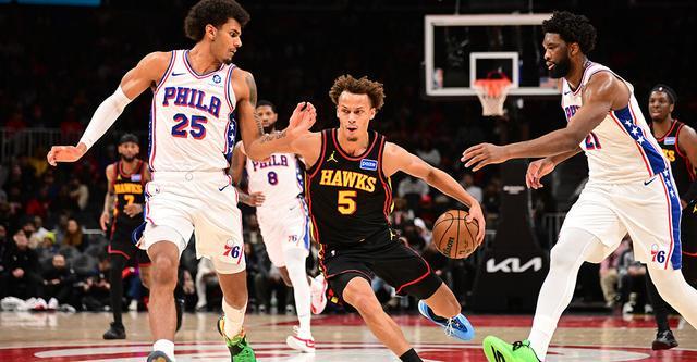 北京时间12月15日,NBA常规赛再战一场,格里姆斯错失绝平三分,老鹰主场120-117险胜76人避免连败。此役丹尼尔斯27分10篮板4助攻,奥孔古20分15篮板,杰伦-约翰逊12分10篮板12助攻,连续4场比赛斩获三双;76人队无缘连胜,乔治空砍35分,埃奇库姆26分6篮板,恩比德22分14篮板,格里姆斯14分7助攻。 (NBA官网) |