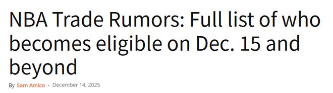 以下是符合条件的完整球员名单,按其2025-26赛季的薪资占工资帽额度排序。 12月16日起可被交易球员(共计77人)名单如下—— 詹姆斯-哈登——39,182,693美元 凯里-欧文——36,566,002美元 朱利叶斯-兰德尔——30,864,198美元 迈尔斯-特纳——25,318,251美元 弗雷德-范弗里特——25,000,000美元 邓肯-罗宾逊——16,834,692美元 尼基尔-亚历山大-沃克——15,161,800美元 卡里斯-勒韦尔——14,104,000美元 达米安-利拉德——14,104,000美元 丹尼斯-施罗德——14,104,000美元 博比-波蒂斯——13,445,754美元 多里安-芬尼-史密斯——12,700,000美元 卢克-肯纳德——11,000,000美元 卢克-科内特——11,000,000美元 布鲁克-洛佩斯——8,750,000美元 泰-杰罗姆——8,781,000美元 德安德烈-艾顿——8,104,000美元 特雷-琼斯——8,000,000美元 凯文-卢尼——8,000,000美元 克林特-卡佩拉——6,700,000美元 戴罗恩-夏普——6,250,000美元 扎伊尔-威廉姆斯——6,250,000美元 杰克-拉拉维亚——6,000,000美元 卡梅伦-托马斯——5,993,172美元 丹吉洛-拉塞尔——5,685,000美元 尼古拉斯-巴图姆——5,601,600美元 盖尔雄-亚布塞莱——5,500,000美元 布拉德利-比尔——5,354,000美元 马库斯-斯马特——5,134,000美元 小凯文-波特——5,134,000美元 莫里茨-瓦格纳——5,000,000美元 小加里-特伦特——3,697,105美元 加里-哈里斯——3,634,153美元 贾克森-海斯——3,449,323美元 托里恩-普林斯——3,303,774美元 阿杰伊-米切尔——3,000,000美元 卡梅伦-斯宾塞——2,537,989美元 卢卡-加尔扎——2,461,463美元 杰里科-西姆斯——2,461,463美元 桑德罗-马穆克拉什维利——2,461,463美元 德鲁-史密斯——2,378,870美元 乔什-米诺特——2,378,870美元 克里斯-布歇——2,296,274美元 梅森-普拉姆利——2,296,274美元 小拉里-南斯——2,296,274美元 哈维特-格林——2,296,274美元 萨纳西斯-阿德托昆博——2,296,274美元 科尔-安东尼——2,296,274美元 阿米尔-科菲——2,296,274美元 乔丹-克拉克森——2,296,274美元 兰德里-沙梅特——2,296,274美元 埃里克-戈登——2,296,274美元 加勒特-坦普尔——2,296,274美元 马文-巴格利三世——2,296,274美元 安东尼-吉尔——2,296,274美元 丹特-埃克萨姆——2,296,274美元 布鲁斯-布朗——2,296,274美元 小蒂姆-哈达威——2,296,274美元 杰夫-格林——2,296,274美元 阿隆-霍勒迪——2,296,274美元