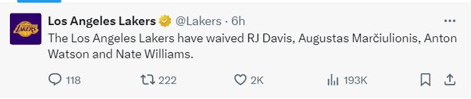 北京时间10月19日,湖人官方宣布,球队已裁掉奥古斯塔斯-马尔丘利奥尼斯、RJ-戴维斯、内特-威廉姆斯和安东-沃森。这四名球员均以非保障的Exhibit10合同参加球队训练营。随着裁员完成...