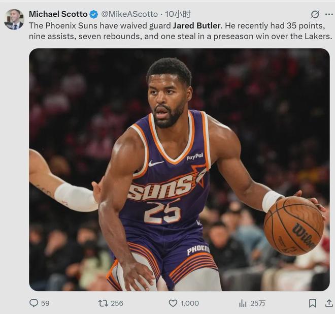 北京时间10月19日,菲尼克斯太阳官方宣布,正式裁掉贾里德-巴特勒,同时给乔丹- 古德温 一份正式合同。两人都是后卫,也是直接竞争关系,此前都是训练营合同。记者Keith Smith表示,...