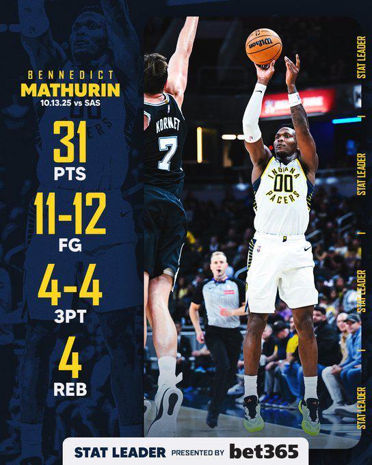 雷速体育10月14日讯 NBA季前赛今日继续进行,步行者108-124不敌马刺。 本场比赛,马瑟林首发出战23分钟,投篮12中11,三分4中4,罚球5中5,得到31分4篮板1助攻1抢断,正负值+11。 赛后,...