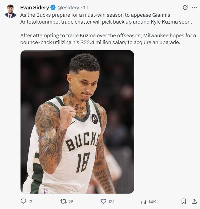 美记Sidery: 为了安抚字母哥从而迎来一个必须要赢的赛季,雄鹿准备利用库兹马的合同作为筹码,去换来一位能升级阵容的球员 。库兹马正在执行的合同27年夏天到期,未来两个赛季薪...