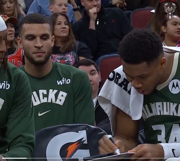 雷速体育10月13日讯 NBA季前赛继续进行,雄鹿今天在客场挑战公牛。 第三节末,坐在替补席的字母哥拿着战术板,认真地画起了战术。一开始旁边的特纳只是在听,最后也忍不住在战术...
