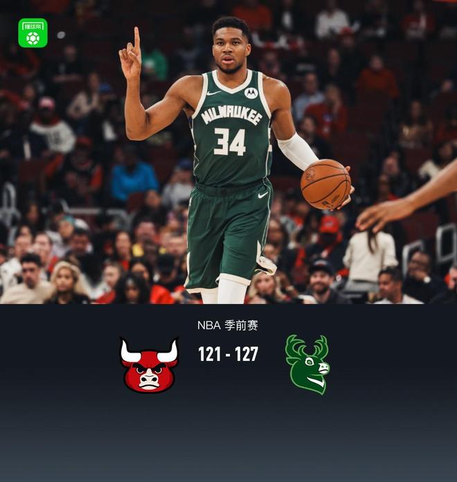 北京时间10月13日NBA 季前赛,芝加哥公牛对阵密尔沃基雄鹿。半场公牛61-65雄鹿,最终公牛121-127雄鹿。芝加哥公牛多森姆22分3板2助,布泽利斯19分4板;密尔沃基雄鹿库兹马19分5板1助,迈...