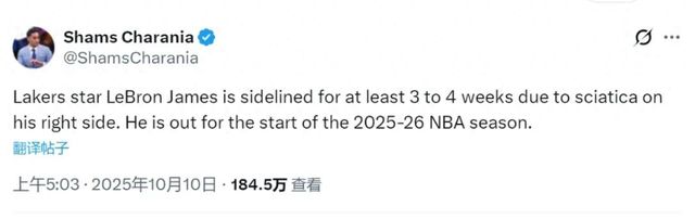 可能很多人都没想到,那个从不低头的铁人勒布朗,终于也向身体低头了。 记者Shams一条推文,震碎整个NBA: “詹姆斯因右侧坐骨神经痛,将缺阵3-4周,计划在11月中旬复出。” 根据赛...
