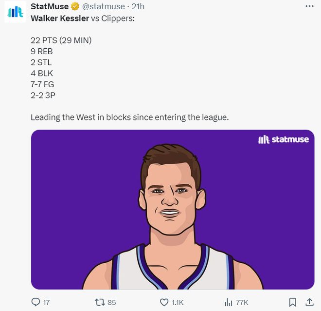 沃克-凯斯勒在揭幕战VS快船的比赛中,29分钟,7中7,三分2中2,拿到22分9篮板2抢断4盖帽,命中率100%,真实命中率高达120%,凯斯勒面对祖巴茨是丝毫不怵,关键是他练出了三分投射。...
