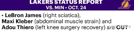 在詹姆斯缺阵情况下,湖人揭幕战不敌勇士,新赛季首场就输球。而且湖人两名大将东契奇和里夫斯,都出现了轻微伤病,第二场对阵森林狼,后者季后赛首轮,正是下克上击败了湖人...