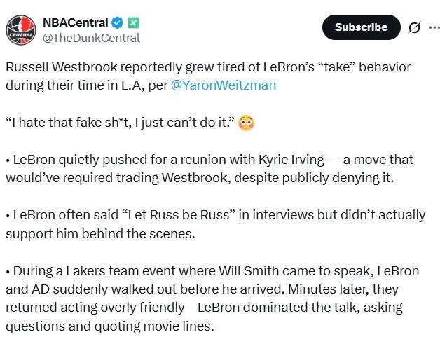 北京时间10月21日,NBA新赛季即将开始,可在这个时候美记Yaron Weitzman撰文谈到了威少效力于湖人时期的往事,这也是引发了很多关注。詹姆斯的人设似乎有些崩塌,威少对他在湖人的“...