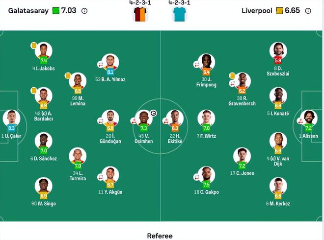北京时间10月1日凌晨,欧冠联赛阶段第2轮,利物浦做客魔鬼主场,挑战土超的加拉塔萨雷。第16分钟,奥斯梅恩打进了索博斯洛伊送上的点球。第56分钟,科纳特犯错,阿利森扑住了奥斯梅恩的单刀后伤退。第66分钟,奥斯梅恩和埃基蒂克先后拉伤被换下场。第88分钟,科纳特制造点球,VAR回看后被取消。最终,加拉塔萨雷主场1-0战胜利物浦,利物浦迎来联赛+欧冠的2连败。 【比赛焦点】 第13分钟,埃基蒂克获得单刀机会,可惜他的射门没有能够踢正,加克波的补射,被防守球员门线解围。 第14分钟,索博斯洛伊在防守的过程中,先是左手手肘击中伊尔马兹的面部,接着右手又打在伊尔马兹的脸上,裁判果断判罚点球。 第16分钟,奥斯梅恩操刀主罚,大力射向中路。凭借这一进球,奥斯梅恩成为欧冠赛场上进球最多的尼日利亚球员。 第55分钟,科纳特的回传,被奥斯梅恩抢断,奥斯梅恩的单刀射门,被阿利森直接没收。这一次的扑救,也造成了阿利森的受伤,玛玛达什维利替补登场。 第88分钟,禁区内科纳特起脚射门时痛苦倒地,裁判判罚点球,VAR介入,原来是科纳特踢到对方后痛苦倒地,点球被取消。 【精彩瞬间】 第2分钟,伊尔马兹高速插上,甩开弗林蓬形成单刀,阿利森及时出击,将球挡出底线。 第31分钟,加克波将球传到后点,弗林蓬头球摆渡,维尔茨回撤过程中凌空抽射,门将奋力将球扑出。 第32分钟,利物浦获得角球,加克波主罚,科纳特抢在门将出击之前,前点头球,直接把球顶偏了。 上半场补时阶段,加拉塔萨雷的高位逼抢收到效果,赫拉芬贝赫被断,之后他在背后放倒奥斯梅恩,还好是在禁区外。 第48分钟,弗林蓬极限下底传中,埃基蒂克脚后跟射门,加拉塔萨雷门将及时反应,将球挡出。 第66分钟,奥斯梅恩和埃基蒂克先后拉伤,两人双双被换下场。 【球员评分】 【出场阵容】 利物浦首发:1-阿利森(56’25-玛玛达什维利)、6-科尔克兹、4-范迪克、5-科纳特、30-弗林蓬(62’12-布拉德利)、17-琼斯、38-赫拉芬贝赫(62’9-伊萨克)、8-索博斯洛伊、18-加克波(62’11-萨拉赫)、7-维尔茨、22-埃基蒂克(67’10-麦卡利斯特)。 利物浦替补:28-伍德曼、2-戈麦斯、3-远藤航、26-罗伯逊、73-恩古莫哈。 加拉塔萨雷首发:1-恰基尔、90-辛格、6-达文森·桑切斯、42-巴尔达什彻、4-伊斯梅尔-雅各布斯、34-托雷拉、99-勒米纳、11-阿克金(71’7-罗兰-绍洛伊)、20-京多安(75’8-萨拉)、53-伊尔马兹(85’17-埃尔马利)、45-奥斯梅恩(71’9-伊卡尔迪)。 加拉塔萨雷替补:19-古文茨、3-梅特汉·巴尔塔奇、23-艾汗、91-乌尼亚、10-萨内、18-库特卢、21-库图库、30-德米尔。 |
