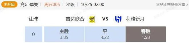 吉达联合3胜1平1负积10分排名联赛第5,不过球队近期状态不佳,近4场比赛仅对阵伊拉联球队巴格达警察的比赛取胜,对方虽常年霸榜伊拉联,但伊拉联竞争力明显不足,且对手总身价也仅有688万欧,赢球含金量不高。特别是进攻端状态不太稳定,其中有2场比赛没有进球入账,其中最主要的原因是本泽马的状态下滑,要知道本泽马新赛季仅首轮对阵阿科多的比赛拿到帽子戏法,其余比赛均颗粒无收,并在上场联赛中罚丢点球,加之上场亚冠比赛他也因伤缺席,37岁的高龄加上受伤,本场比赛即使能够上场也很难找回状态。 利雅得新月3胜2平积11分排名联赛第4,特别是近2轮联赛狂轰8粒进球,场均进球数高达4个,其中莱昂纳多斩获4粒进球,连场上演梅开二度状态十分火热。 数据方面初始给到客让0.5的优势,后市上调至客让0.75,双方近10次交锋客队8胜1平1负明显占优,市场也给到了充足的信心。且利雅得新月客场作战能力不俗,近7场比赛拿到6胜1平的不败佳绩,本场比赛更看好客胜。 竞彩选择负,预测比分1:2或0:2。 |