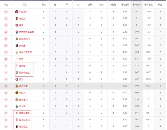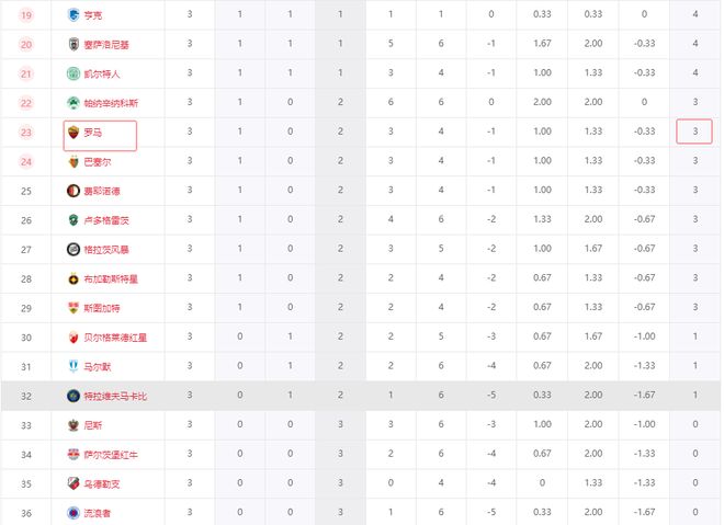 积分榜方面,随着维拉、罗马爆冷输球,贝蒂斯也无力赢球,本轮过后英超、西甲和意甲竟无一队能挤入前8,法甲和德甲则是各有一队进前8,里昂3连胜排在第3,弗赖堡2胜1平排在第6。中日德兰3连胜,1个净胜球优势力压布拉加和里昂领跑。惨遭逆转的维拉2连胜被终止,排名跌到第10,排在塞尔塔之后。贝蒂斯第16,诺丁汉森林第17,意甲两强更惨,博洛尼亚排在第18,罗马第23。 |