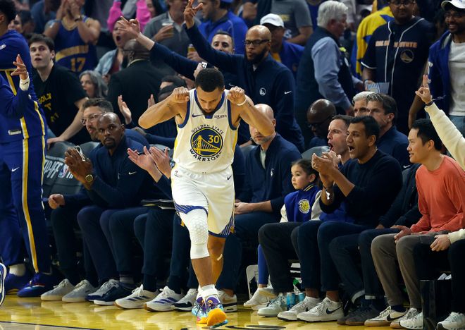 库里第四节最后时刻命中超远扳平三分,怒吼庆祝拖进加时赛。 比赛回顾 掘金休赛期引进卡约、瓦兰丘纳斯与小哈达威,并签回昔日总冠军功臣布鲁斯-布朗,勇士本场缺少穆迪、梅尔顿与图希。首节开局勇士内外开花10-0领先,其中库里与波杰姆斯基各中一记三分,约基奇、穆雷与布劳恩携手打出12-0攻势反超比分。勇士追到14-14,布劳恩暴扣与戈登三分命中,勇士连追4分,戈登两罚全中与再中两记三分,巴特勒一人连得9分,瓦兰丘纳斯与穆雷各得2分,首节结束勇士27-31落后掘金。首节勇士三分13中3,掘金三分9中3,戈登三分3中3得到11分。
