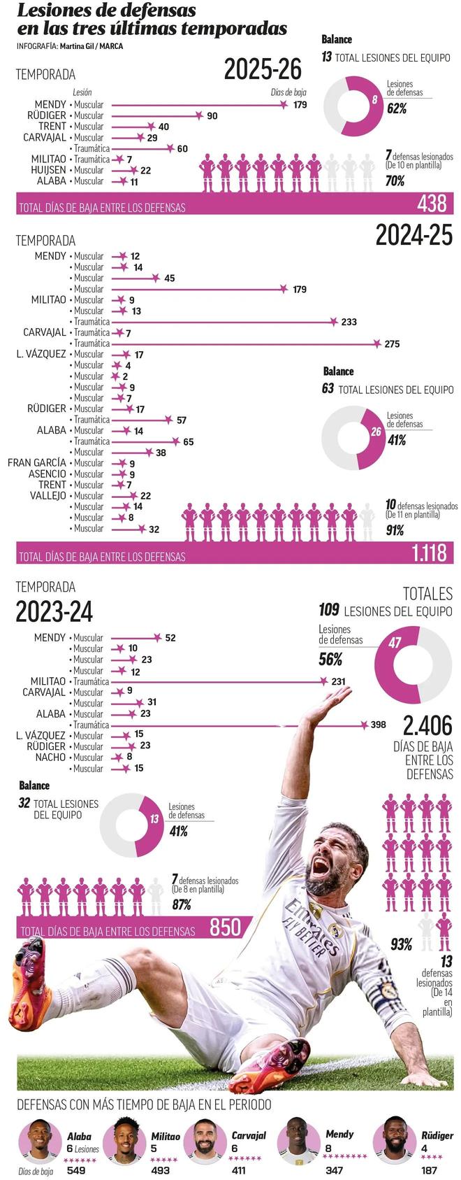 后卫线的伤病问题已为皇马敲响警钟。困扰球队的不仅是球员伤缺,更有对那些累计身体损耗、状态存疑球员的担忧。阿拉巴(近三个赛季6次伤病,缺席549天)、米利唐(5次伤病,缺席493天)、卡瓦哈尔(6次伤病,缺席411天)、门迪(8次伤病,缺席347天)与吕迪格(4次伤病,缺席187天)均在此列。“他们身上早已布满战伤疤痕。” 巴尔德贝巴斯基地(皇马训练基地)内部人员发出这样的警示。 皇马迅速做出反应,今年夏天已启动后卫线变革——签下卡雷拉斯、赫伊森与阿诺德,同时还有阿森西奥在一线队。这场变革尚未结束,下一个篇章将在明年夏天开启。